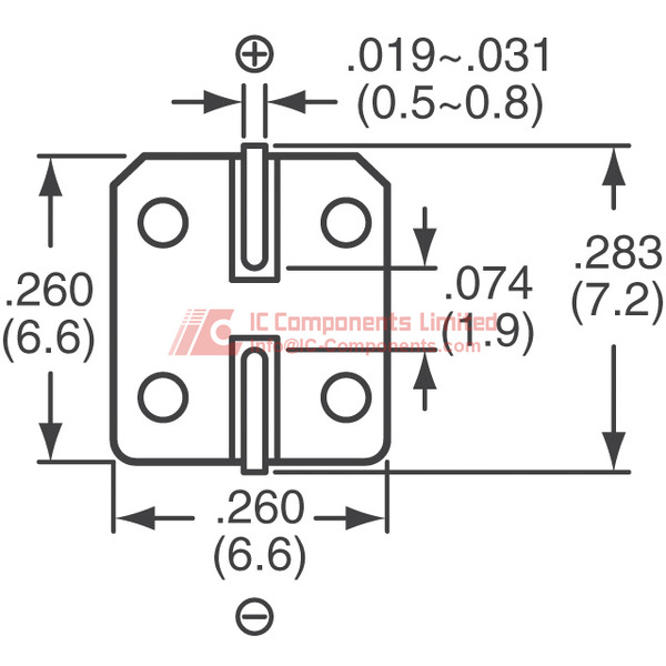 Montagetype: Oppervlaktemontage (SMT). Voorzien van oppervlaktemontage landgrootte van 0,260 inch bij 0,260 inch (6,60 mm bij 6,60 mm). Polaire structuur aanwezig, wat correcte polariteitsaanduiding vereist tijdens montage.
